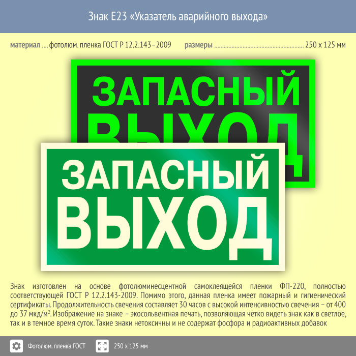 Знак E23 «Указатель запасного выхода» (устаревший) (фотолюминесцентная пленка ГОСТ 34428-2018, 250х125 мм) в Волгограде купить
