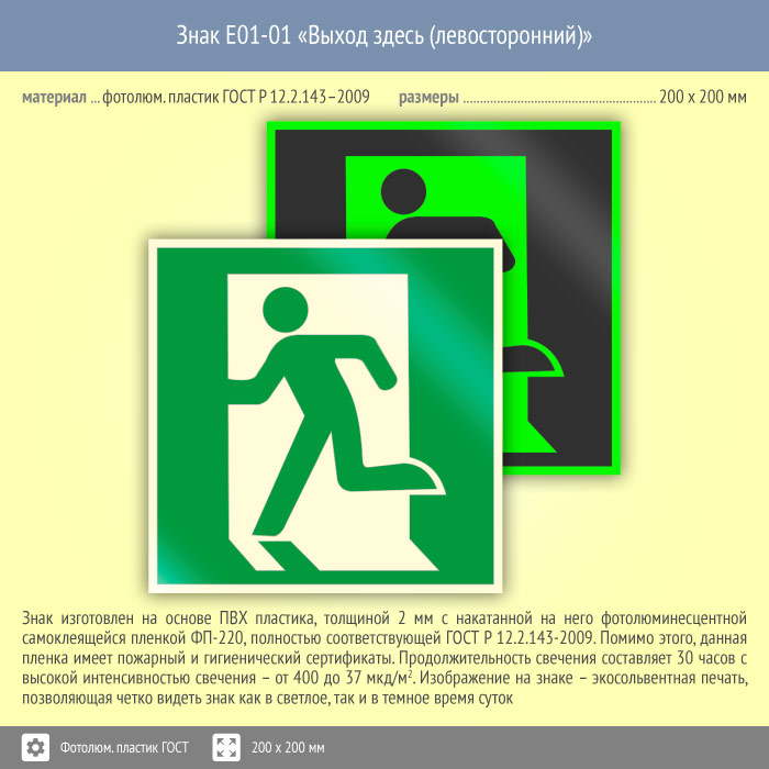 Знак E01-01 «Выход здесь (левосторонний)» (фотолюминесцентный пластик ГОСТ 34428-2018, 200х200 мм) в Волгограде купить
