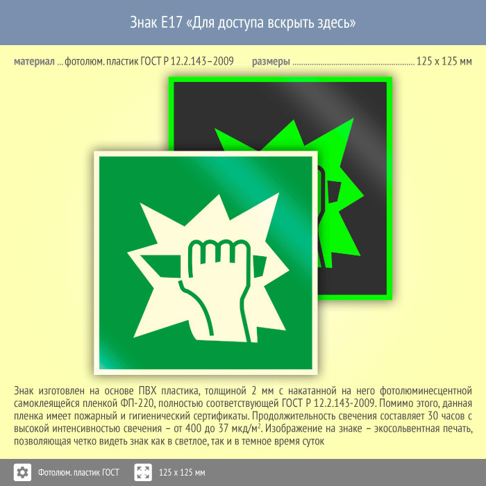 Знак E17 «Для доступа вскрыть здесь» (фотолюминесцентный пластик ГОСТ 34428-2018, 125х125 мм) в Волгограде купить