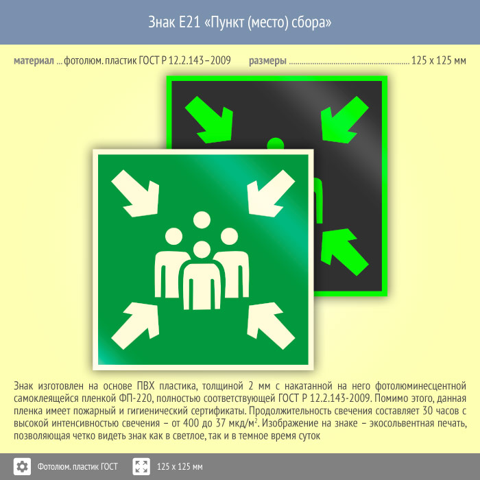 Знак E21 «Пункт (место) сбора» (фотолюминесцентный пластик ГОСТ 34428-2018, 125х125 мм) в Волгограде купить