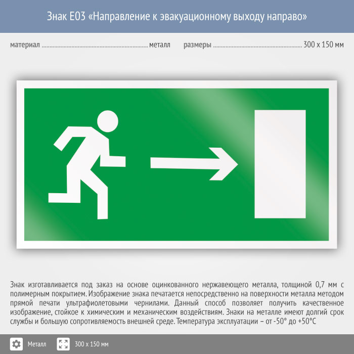Знак E03 «Направление к эвакуационному выходу направо» (металл, 300х150 мм) в Волгограде купить