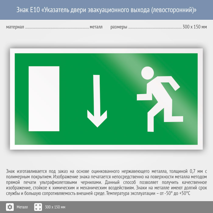 Знак E10 «Указатель двери эвакуационного выхода (левосторонний)» (металл, 300х150 мм) в Волгограде купить