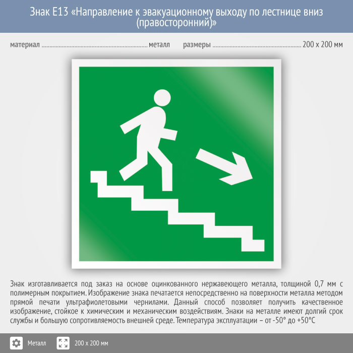 Знак E13 «Направление к эвакуационному выходу по лестнице вниз (правосторонний)» (металл, 200х200 мм) в Волгограде купить