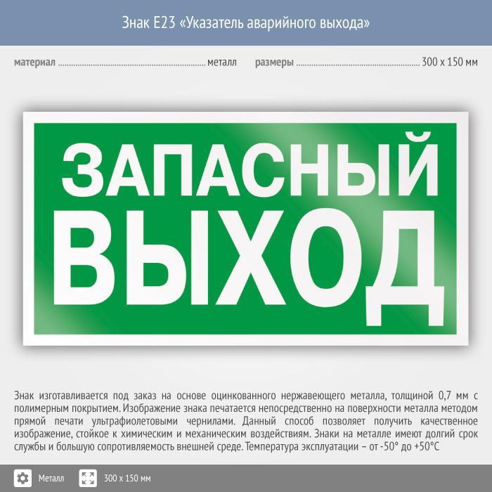 Знак E23 «Указатель запасного выхода» (устаревший) (металл, 300х150 мм) в Волгограде купить