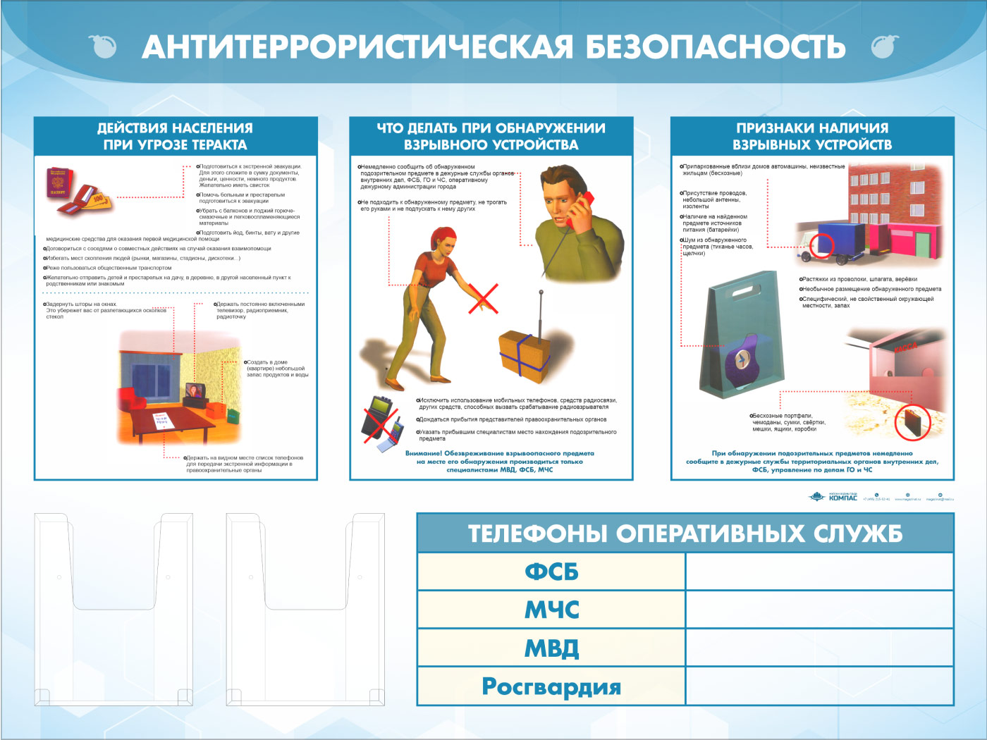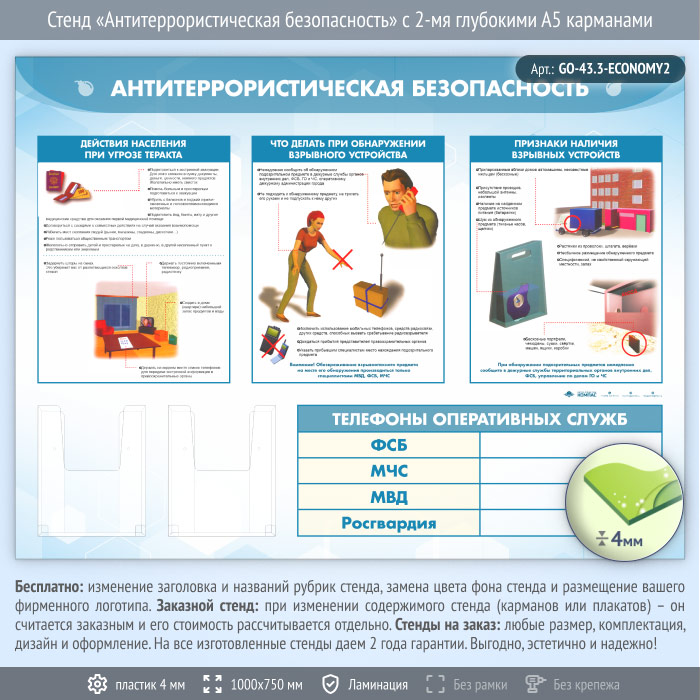 Стенд «Антитеррористическая безопасность» с 2-мя глубокими А5 карманами (GO-43.3-ECONOMY2) в Волгограде купить