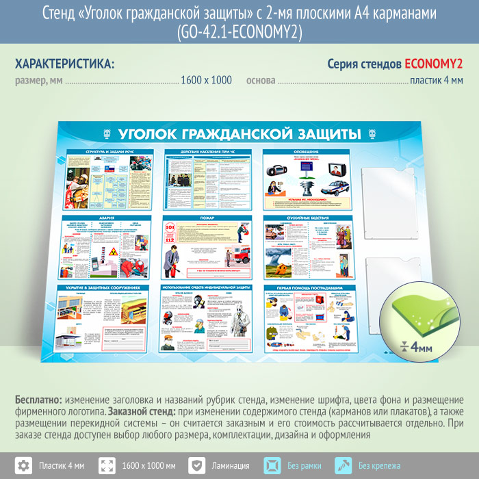 Стенд «Уголок гражданской защиты» с 2-мя плоскими А4 карманами (GO-42.1-ECONOMY2) в Волгограде купить