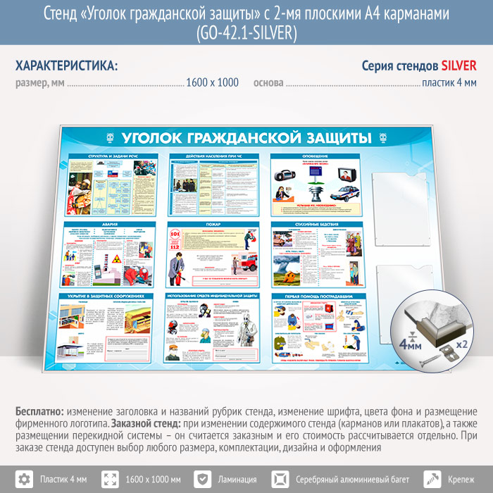 Стенд «Уголок гражданской защиты» с 2-мя плоскими А4 карманами (GO-42.1-SILVER) в Волгограде купить