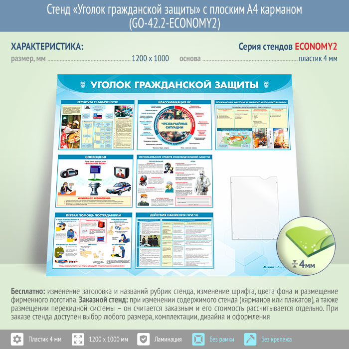 Стенд «Уголок гражданской защиты» с плоским А4 карманом (GO-42.2-ECONOMY2) в Волгограде купить