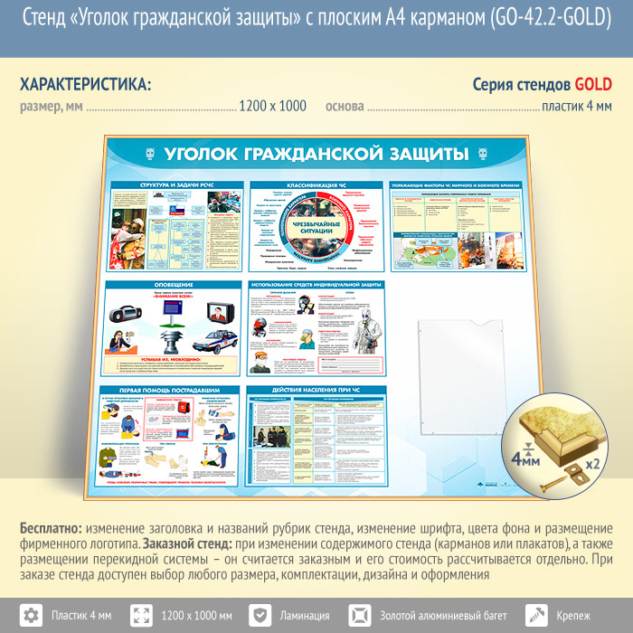 Стенд «Уголок гражданской защиты» с плоским А4 карманом (GO-42.2-GOLD) в Волгограде купить
