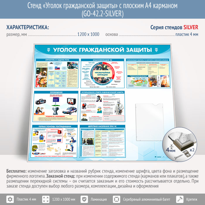 Стенд «Уголок гражданской защиты» с плоским А4 карманом (GO-42.2-SILVER) в Волгограде купить