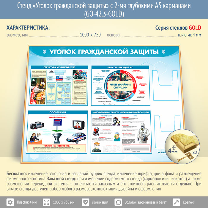 Стенд «Уголок гражданской защиты» с 2-мя глубокими А5 карманами (GO-42.3-GOLD) в Волгограде купить