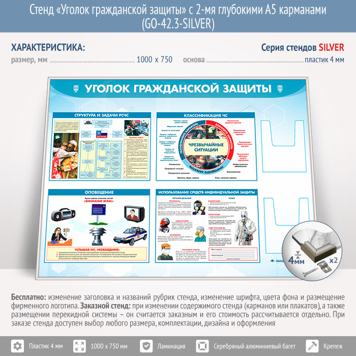 Стенд «Уголок гражданской защиты» с 2-мя глубокими А5 карманами (GO-42.3-SILVER) в Волгограде купить