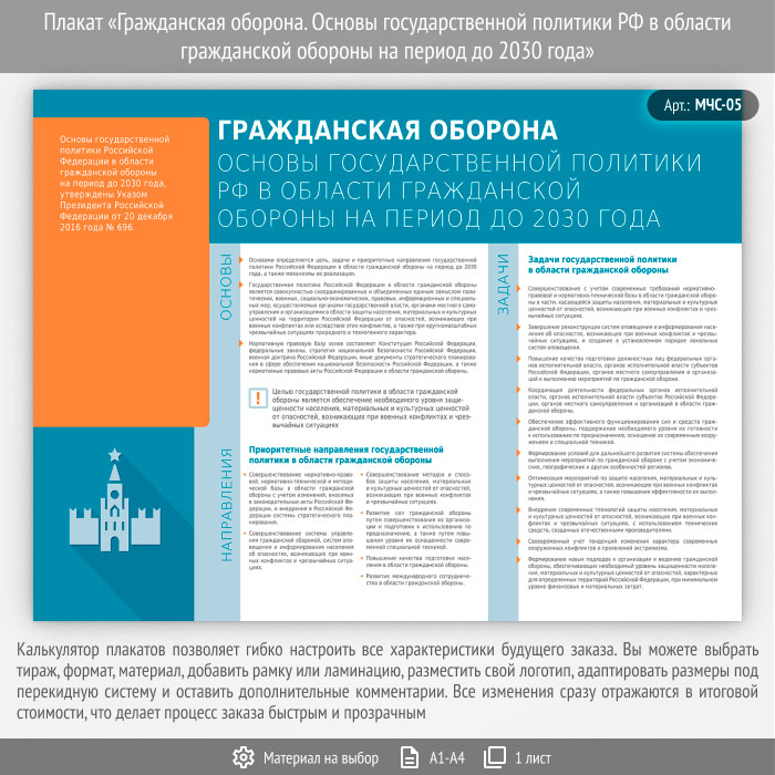 Плакат «Гражданская оборона. Основы государственной политики РФ в области гражданской обороны на период до 2030 года» (МЧС-05, 1 лист) в Волгограде купить