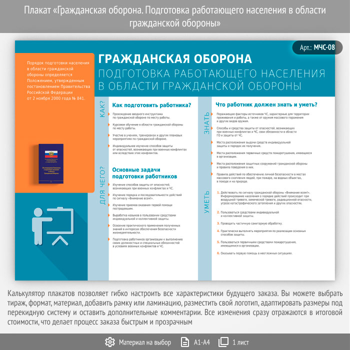 Плакат «Гражданская оборона. Подготовка работающего населения в области гражданской обороны» (МЧС-08, 1 лист) в Волгограде купить