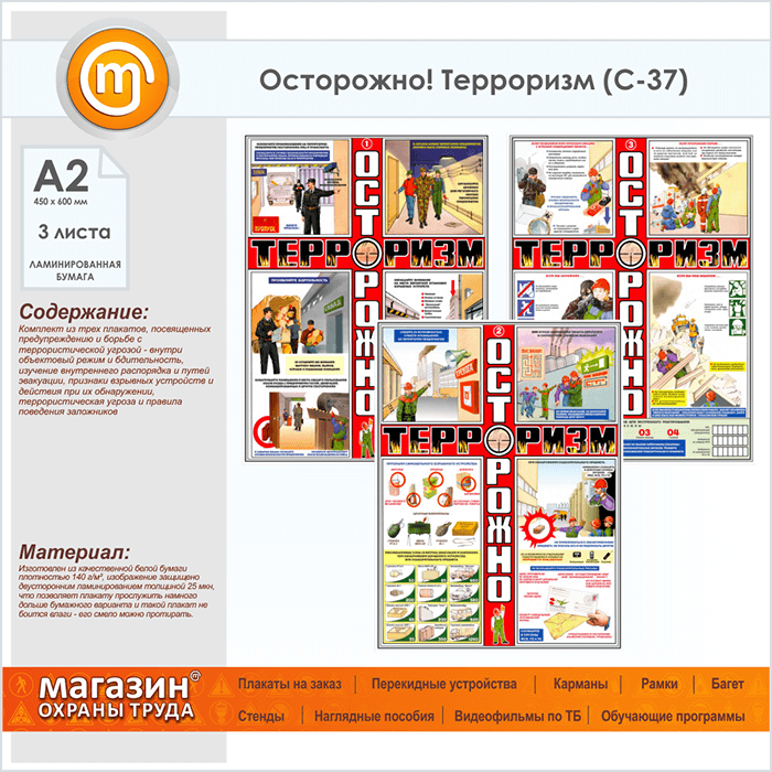 Плакаты «Осторожно! Терроризм» (С-37, ламинированная бумага, А2, 3 листа) в Волгограде купить