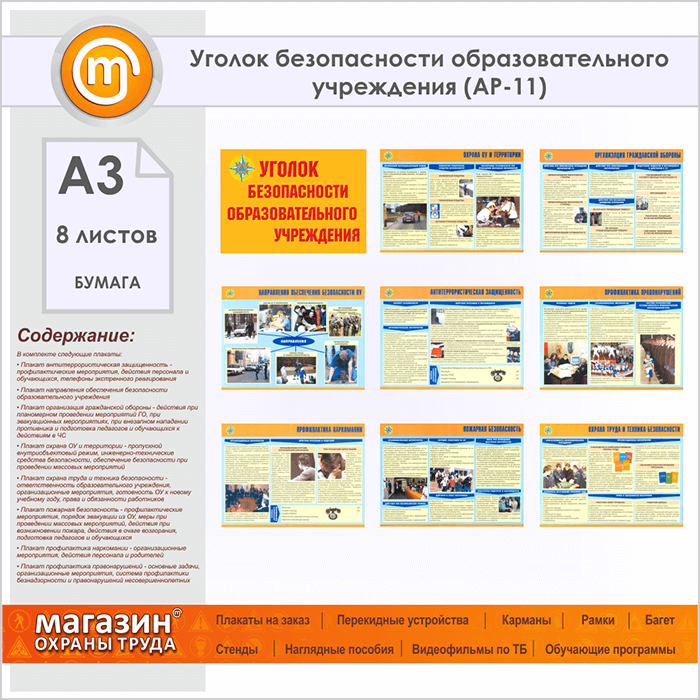Плакаты «Уголок безопасности образовательного учреждения» (АР-11, бумага, А3, 8 листов) в Волгограде купить