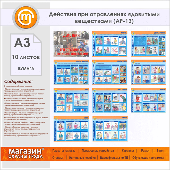 Плакаты «Действия при отравлениях ядовитыми веществами» (АР-13, бумага, А3, 10 листов) в Волгограде купить