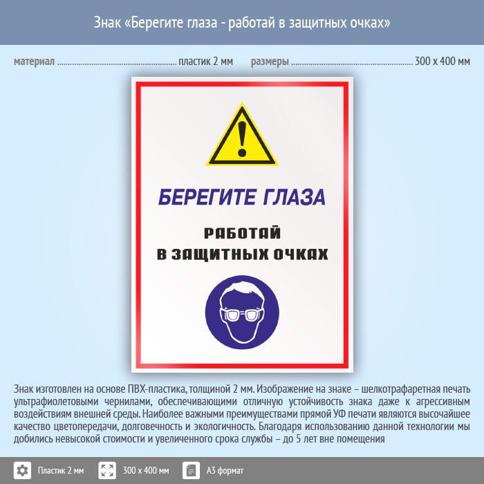 Знак «Берегите глаза - работай в защитных очках», КЗ-04 (пластик, 300х400 мм) в Волгограде купить