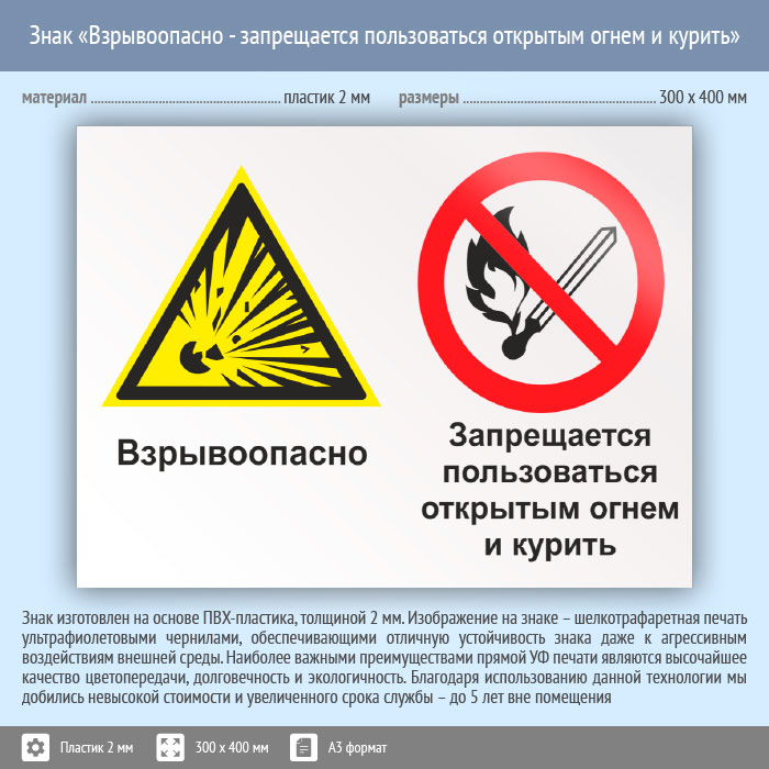 Знак «Взрывоопасно - запрещается пользоваться открытым огнем и курить», КЗ-07 (пластик, 400х300 мм) в Волгограде купить