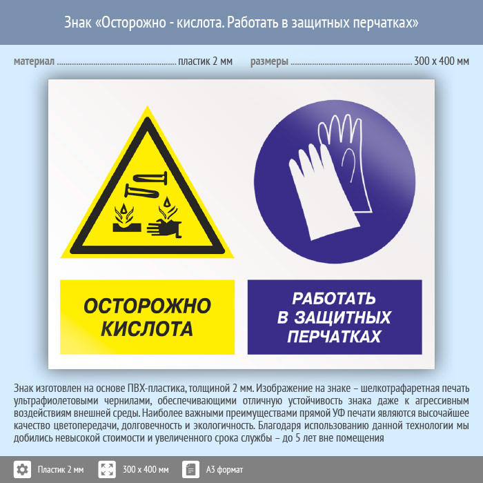Знак «Осторожно - кислота. Работать в защитных перчатках», КЗ-56 (пластик, 400х300 мм) в Волгограде купить