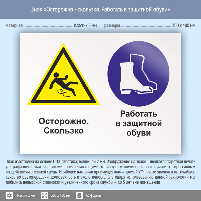 Знак «Осторожно - скользко. Работать в защитной обуви», КЗ-57 (пластик, 400х300 мм) в Волгограде купить
