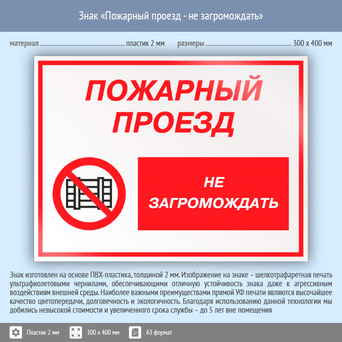 Знак «Пожарный проезд - не загромождать», КЗ-67 (пластик, 400х300 мм) в Волгограде купить