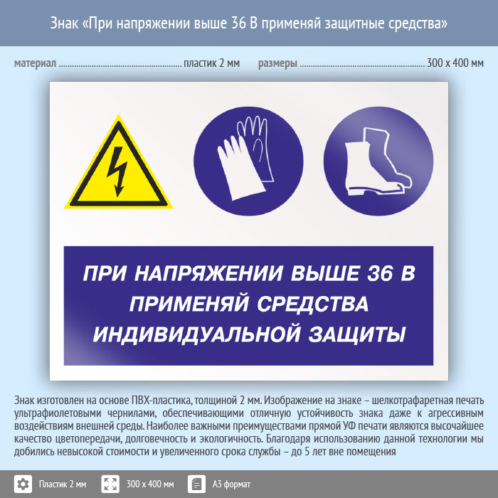 Знак «При напряжении выше 36 В применяй защитные средства», КЗ-71 (пластик, 400х300 мм) в Волгограде купить