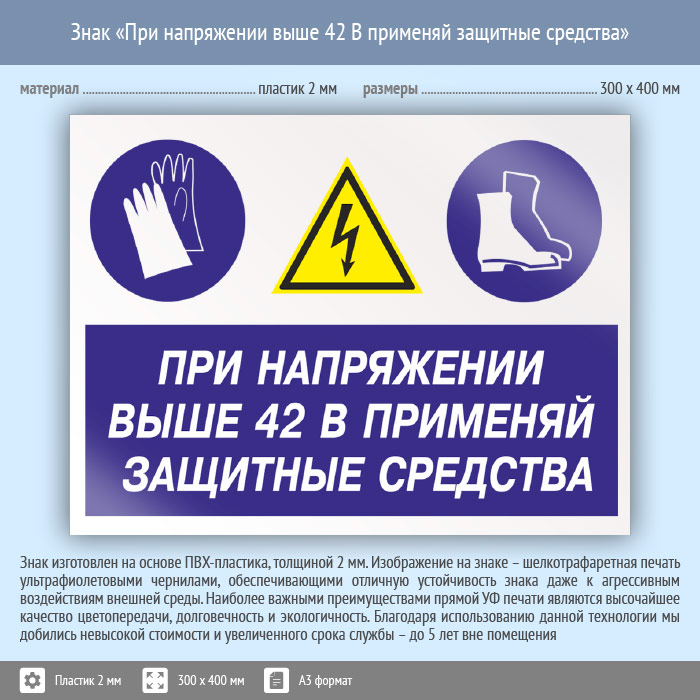 Знак «При напряжении выше 42 В применяй защитные средства», КЗ-72 (пластик, 400х300 мм) в Волгограде купить