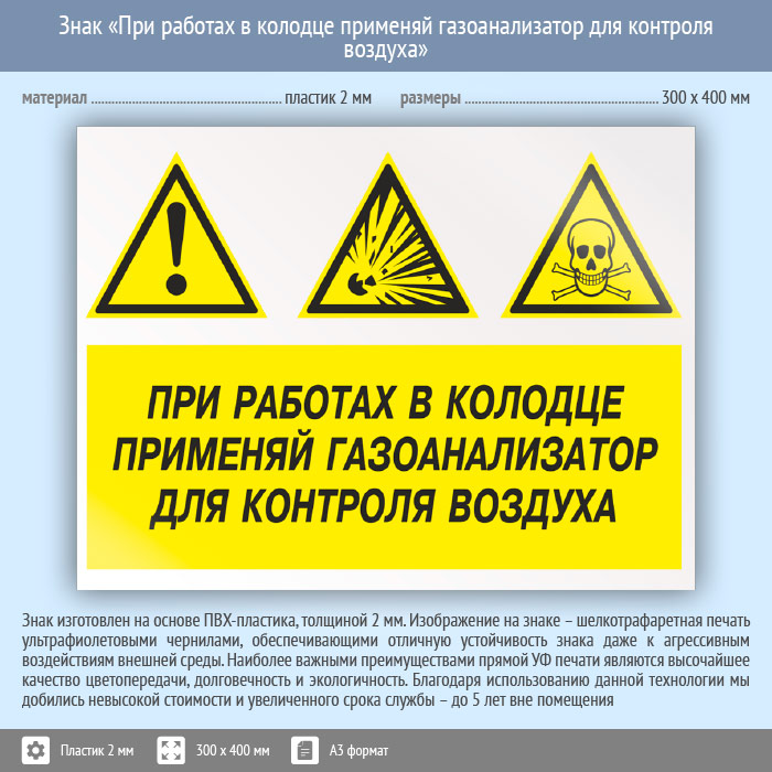 Знак «При работах в колодце применяй газоанализатор для контроля воздуха», КЗ-74 (пластик, 400х300 мм) в Волгограде купить