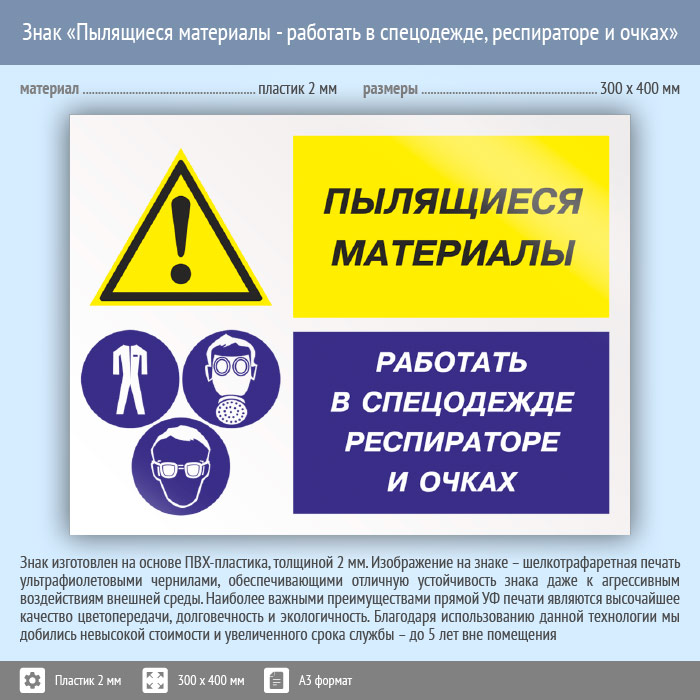 Знак «Пылящиеся материалы - работать в спецодежде, респираторе и очках», КЗ-79 (пластик, 400х300 мм) в Волгограде купить