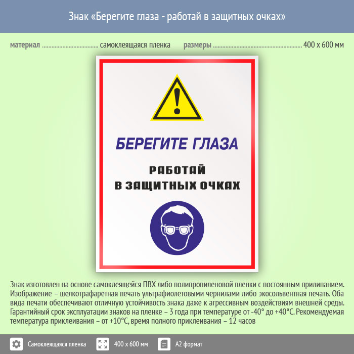 Знак «Берегите глаза - работай в защитных очках», КЗ-04 (пленка, 400х600 мм) в Волгограде купить