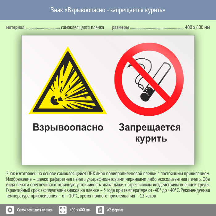Знак «Взрывоопасно - запрещается курить», КЗ-06 (пленка, 600х400 мм) в Волгограде купить