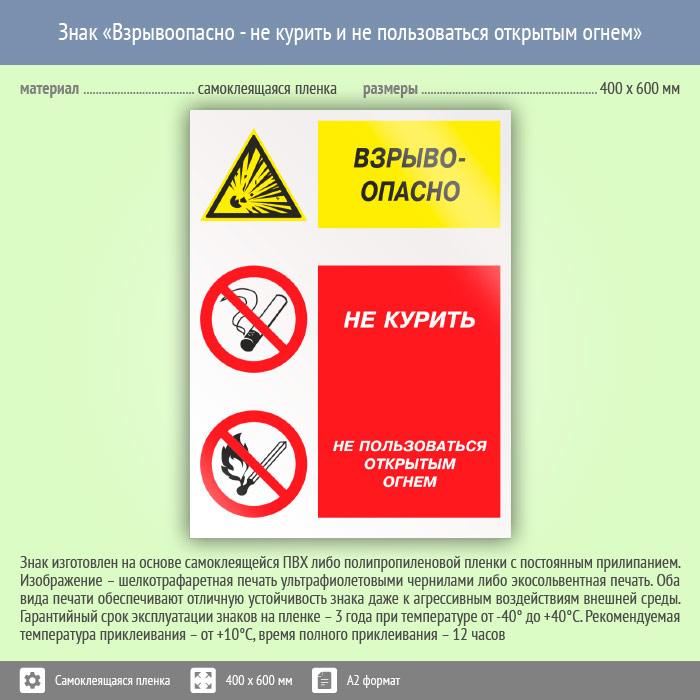 Знак «Взрывоопасно - не курить и не пользоваться открытым огнем», КЗ-08 (пленка, 400х600 мм) в Волгограде купить