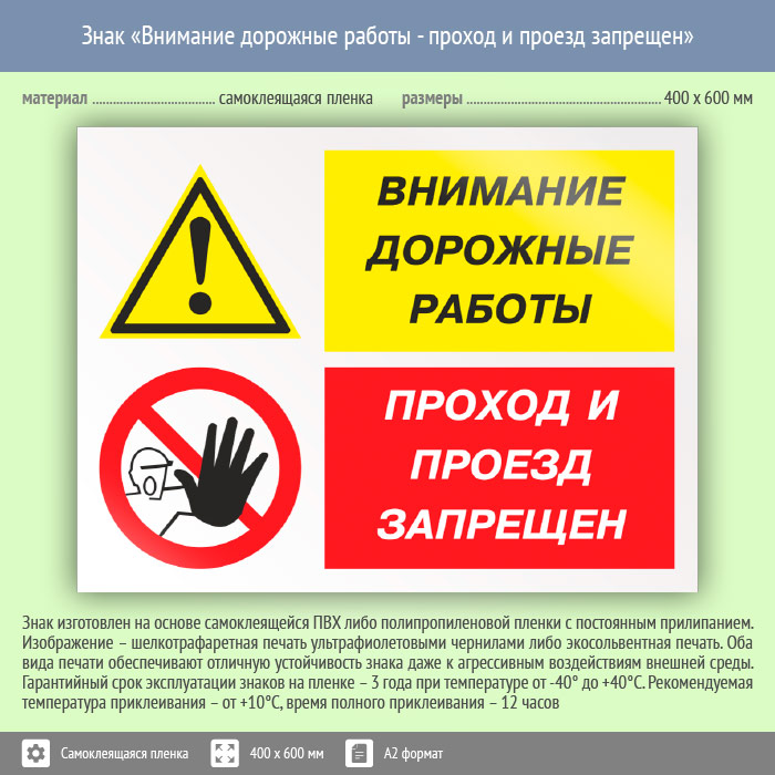 Знак «Внимание дорожные работы - проход и проезд запрещен», КЗ-14 (пленка, 600х400 мм) в Волгограде купить