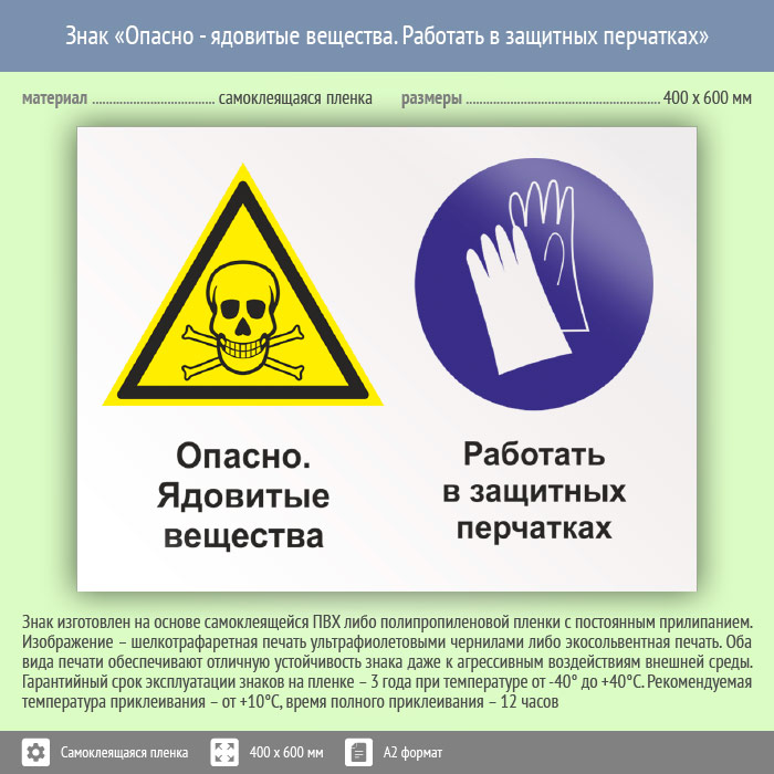 Знак «Опасно - ядовитые вещества. Работать в защитных перчатках», КЗ-43 (пленка, 600х400 мм) в Волгограде купить