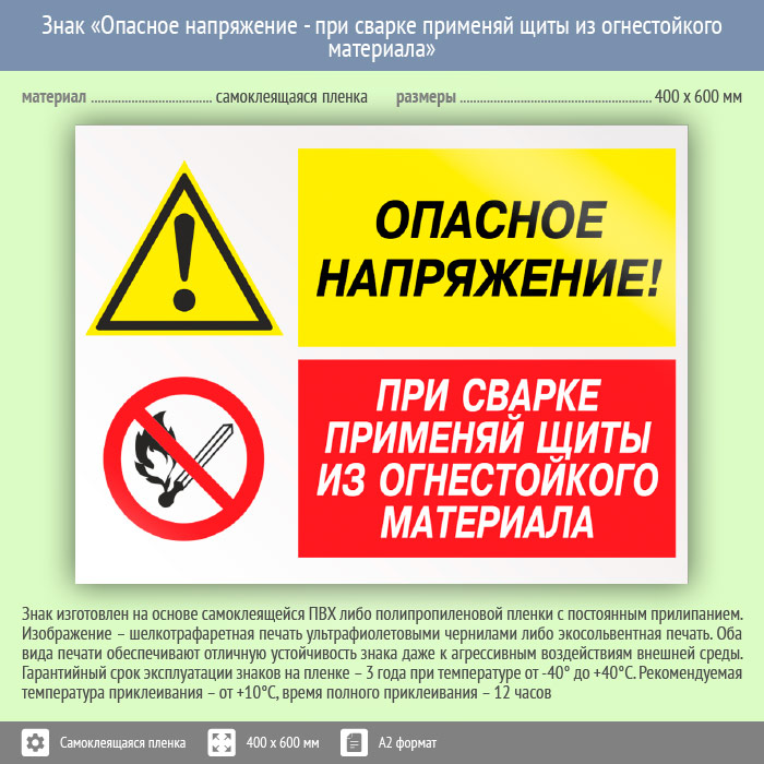 Знак «Опасное напряжение - при сварке применяй щиты из огнестойкого материала», КЗ-46 (пленка, 600х400 мм) в Волгограде купить