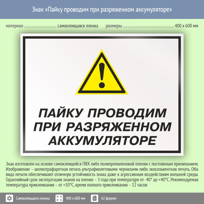 Знак «Пайку проводим при разряженном аккумуляторе», КЗ-62 (пленка, 600х400 мм) в Волгограде купить