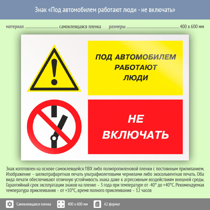 Знак «Под автомобилем работают люди - не включать», КЗ-65 (пленка, 600х400 мм) в Волгограде купить