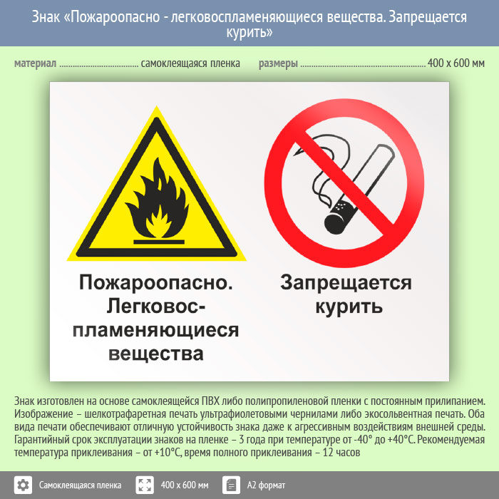 Знак «Пожароопасно - легковоспламеняющиеся вещества. Запрещается курить», КЗ-69 (пленка, 600х400 мм) в Волгограде купить