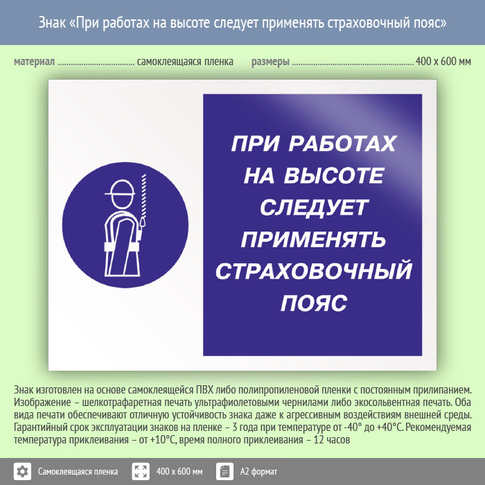 Знак «При работах на высоте следует применять страховочный пояс», КЗ-75 (пленка, 600х400 мм) в Волгограде купить