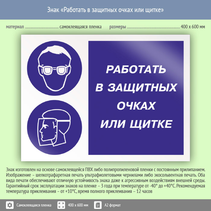 Знак «Работать в защитных очках или щитке», КЗ-80 (пленка, 600х400 мм) в Волгограде купить