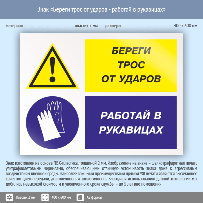 Знак «Береги трос от ударов - работай в рукавицах», КЗ-03 (пластик, 600х400 мм) в Волгограде купить