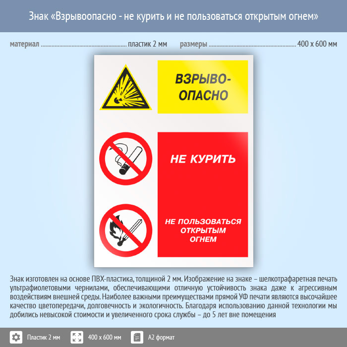 Знак «Взрывоопасно - не курить и не пользоваться открытым огнем», КЗ-08 (пластик, 400х600 мм) в Волгограде купить