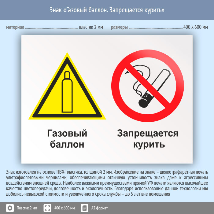Знак «Газовый баллон. Запрещается курить», КЗ-18 (пластик, 600х400 мм) в Волгограде купить