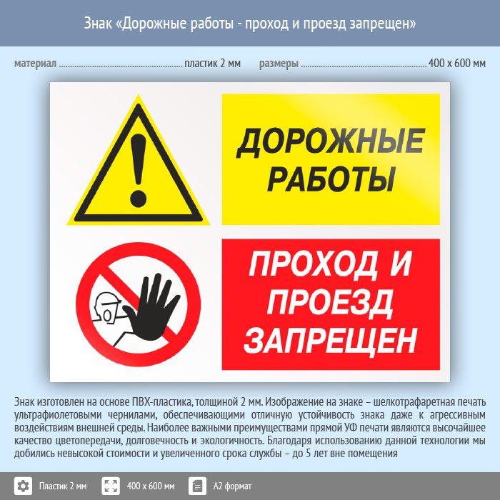 Знак «Дорожные работы - проход и проезд запрещен», КЗ-20 (пластик, 600х400 мм) в Волгограде купить