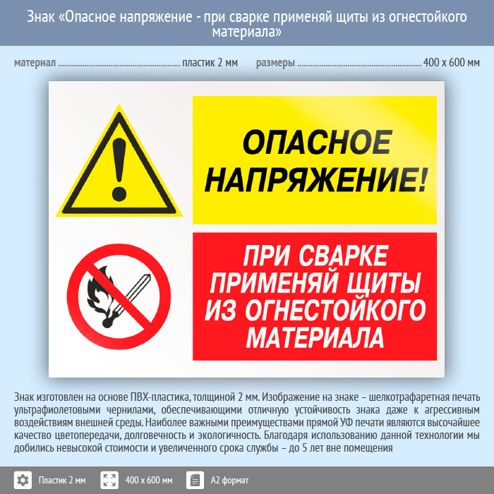 Знак «Опасное напряжение - при сварке применяй щиты из огнестойкого материала», КЗ-46 (пластик, 600х400 мм) в Волгограде купить