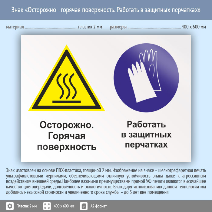 Знак «Осторожно - горячая поверхность. Работать в защитных перчатках», КЗ-55 (пластик, 600х400 мм) в Волгограде купить
