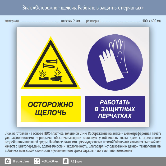 Знак «Осторожно - щелочь. Работать в защитных перчатках», КЗ-60 (пластик, 600х400 мм) в Волгограде купить