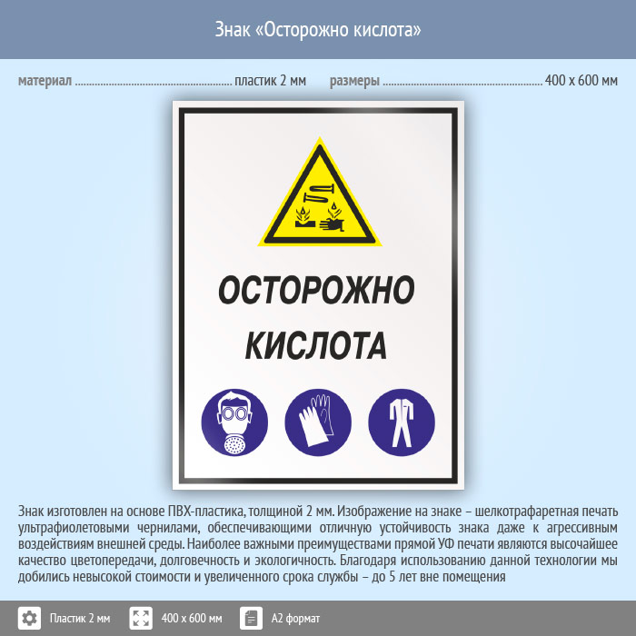 Знак «Осторожно кислота», КЗ-61 (пластик, 400х600 мм) в Волгограде купить