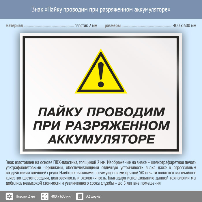 Знак «Пайку проводим при разряженном аккумуляторе», КЗ-62 (пластик, 600х400 мм) в Волгограде купить